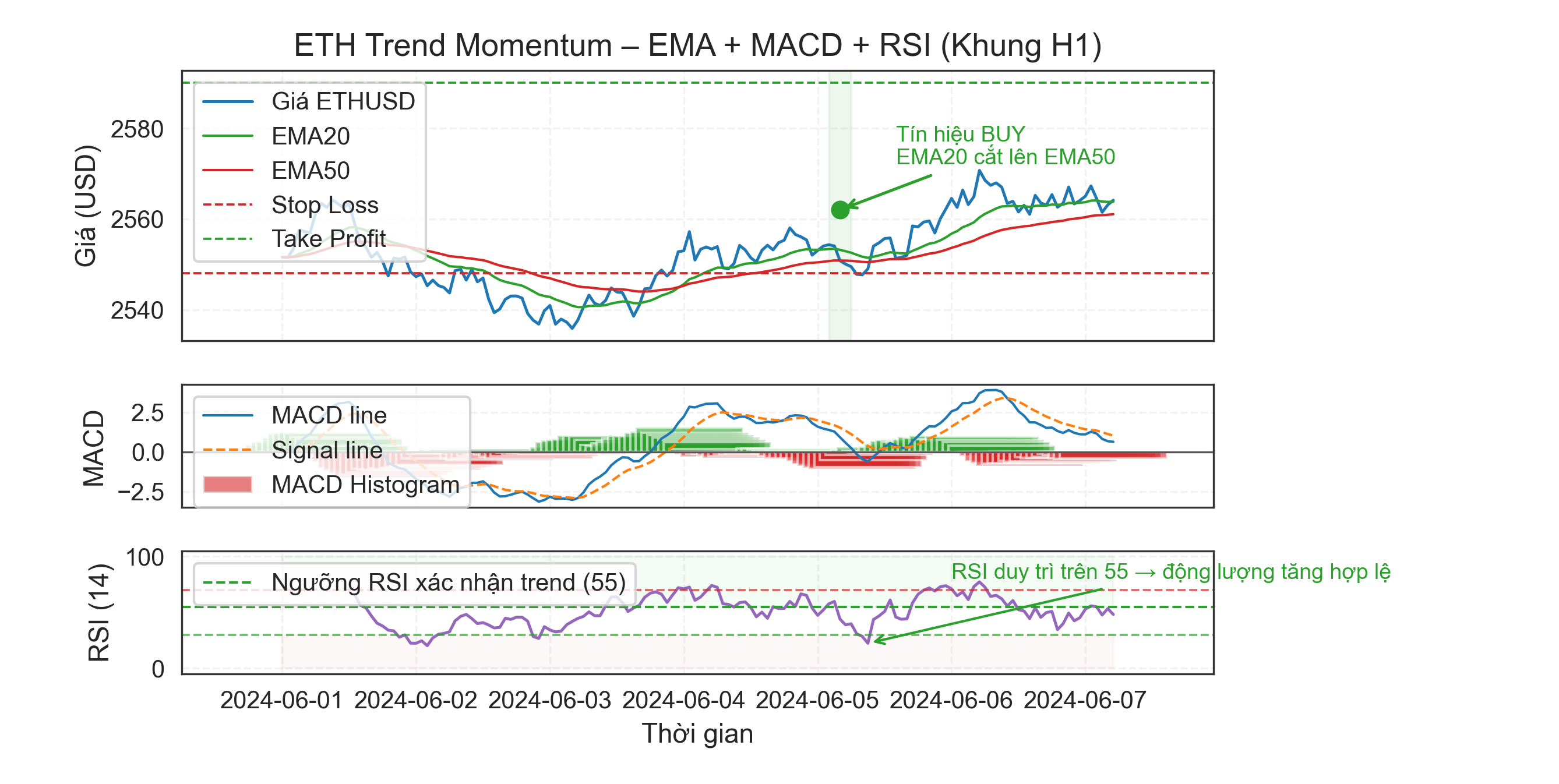 Chiến lược này đặc biệt phù hợp với khung H1 hoặc H4, nơi ETH thường thể hiện các nhịp sóng mạnh và rõ ràng, giúp trader nắm bắt được xu hướng trung hạn kéo dài 2–4 giờ.