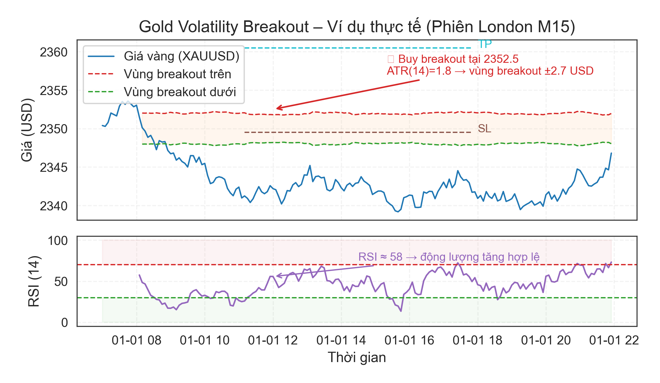 (Trên biểu đồ minh họa: vùng breakout được tô sáng, RSI xác nhận động lượng tăng, ATR thể hiện độ biến động mở rộng.)