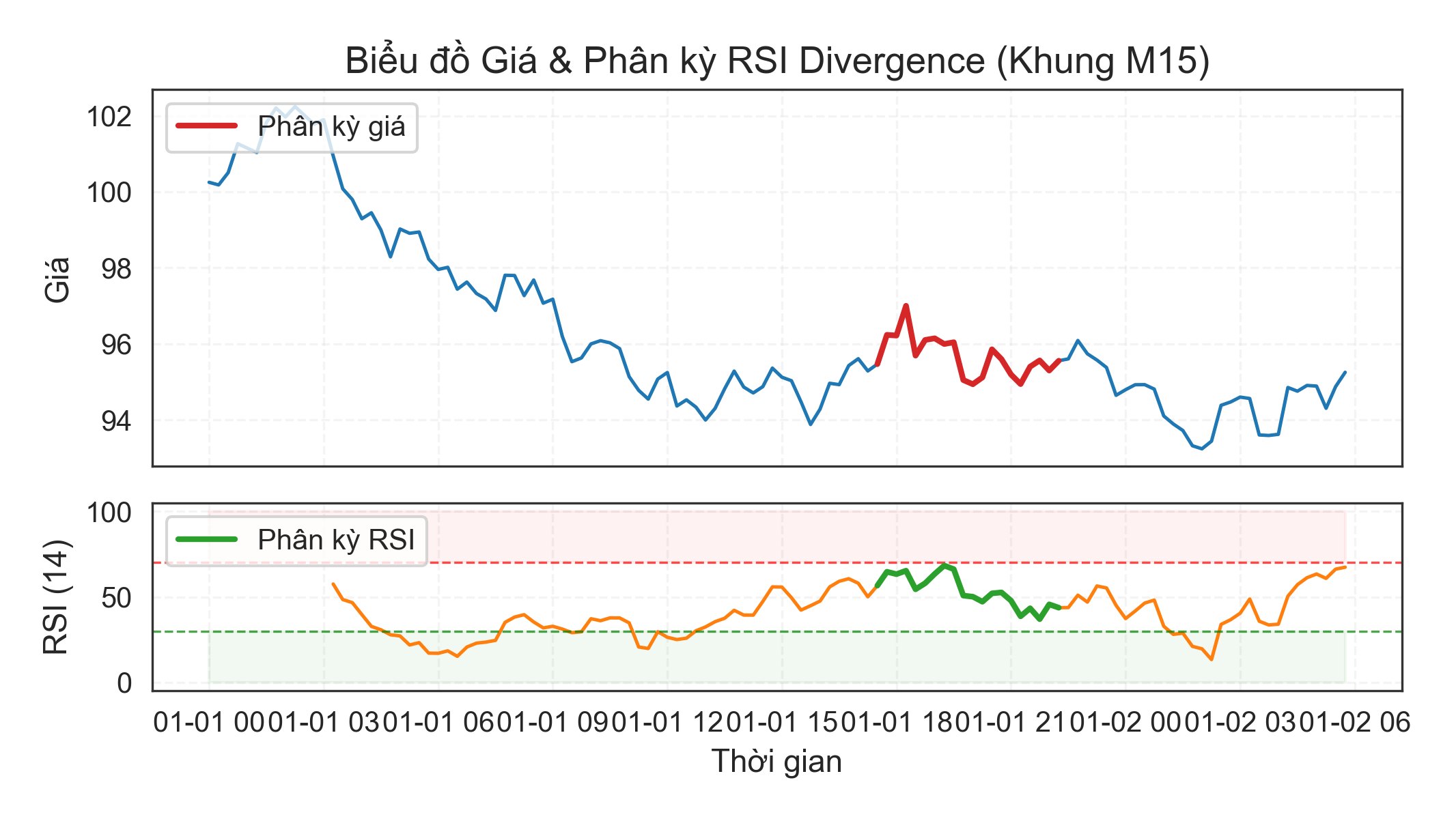 Khi giá tiếp tục tạo đỉnh cao hơn hoặc đáy thấp hơn, nhưng chỉ báo RSI lại không đồng thuận (tạo đỉnh thấp hơn hoặc đáy cao hơn), điều này cho thấy động lượng (momentum) của xu hướng hiện tại đang suy yếu.