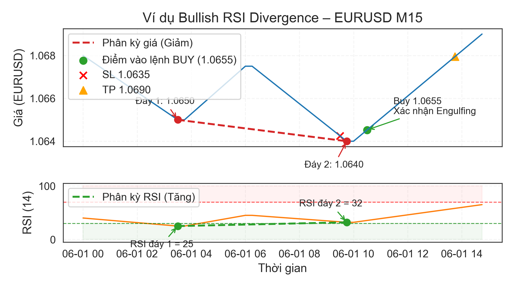 - RSI tạo đáy 1 = 25, đáy 2 = 32 (cao hơn) → xuất hiện Bullish Divergence.
